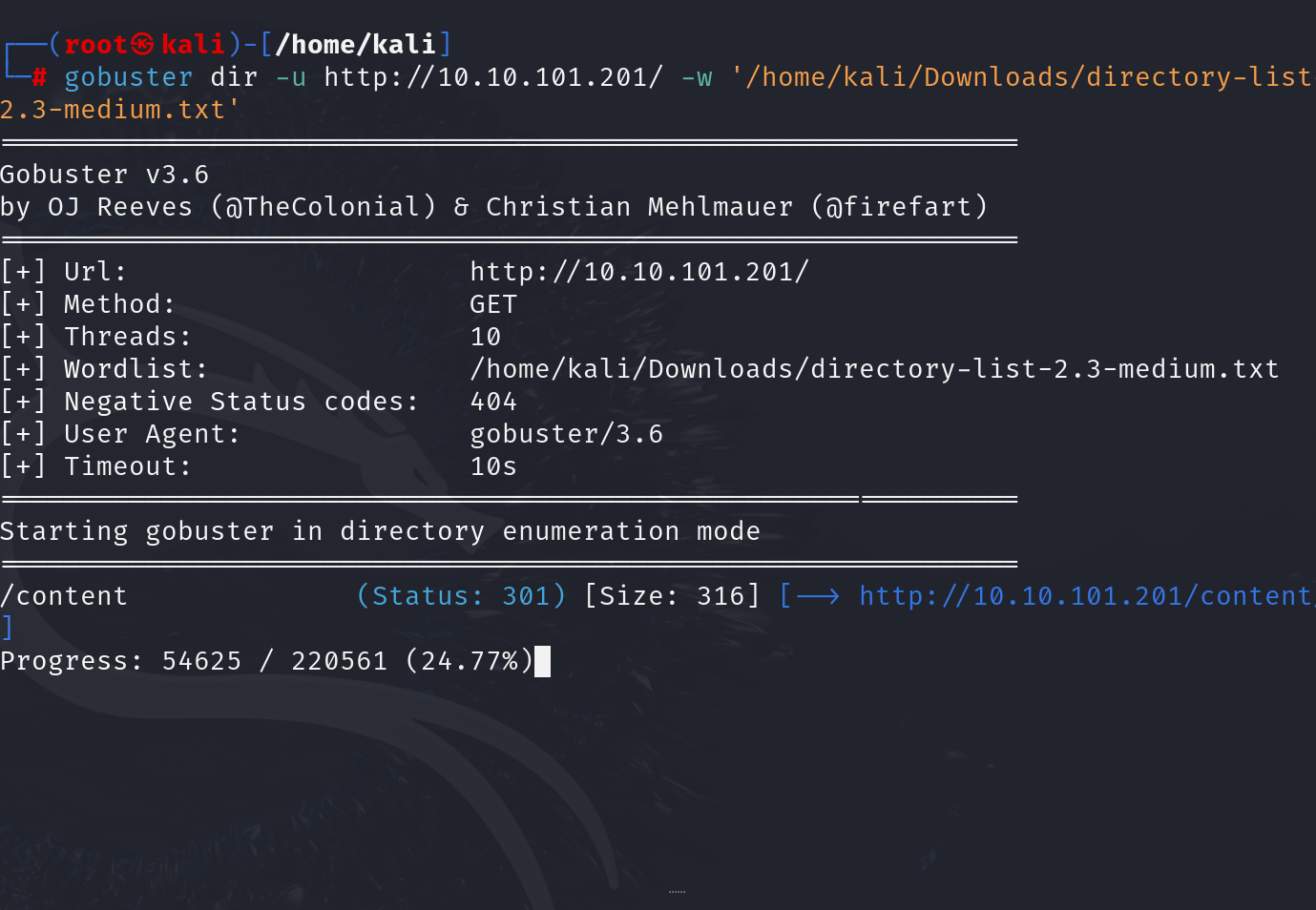 gobuster dir -u http://10.10.101.201/ -w '/home/kali/Downloads/directory-list-2.3-medium.txt'