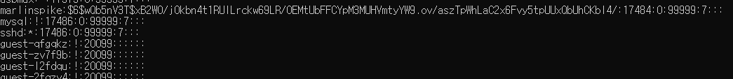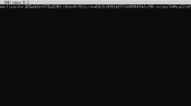 marlinspike:$6$wQb5nV3T$xB2WO/jOkbn4t1RUILrckw69LR/0EMtUbFFCYpM3MUHVmtyYW9.ov/aszTpWhLaC2x6Fvy5tpUUxQbUhCKbl4/:17484:0:99999:7:::