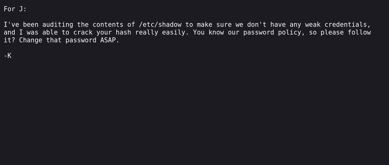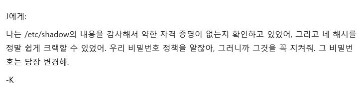 전 Basic Pentesting 1 에 해시를 크랙할수 있어 비밀번호를 바꿔달라고 J 가 K 에게 말한것으로 보인다