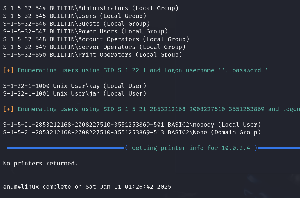 enum4linux 를 사용해 kay 와 jan 이라는 유저에 이름을 알아냈다