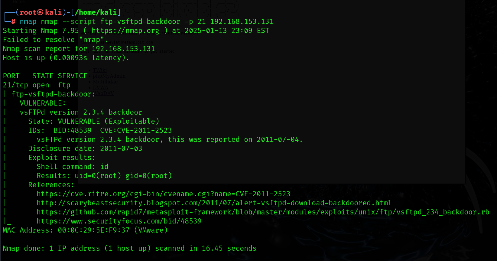 nmap nmap --script ftp-vsftpd-backdoor -p 21 [IP]