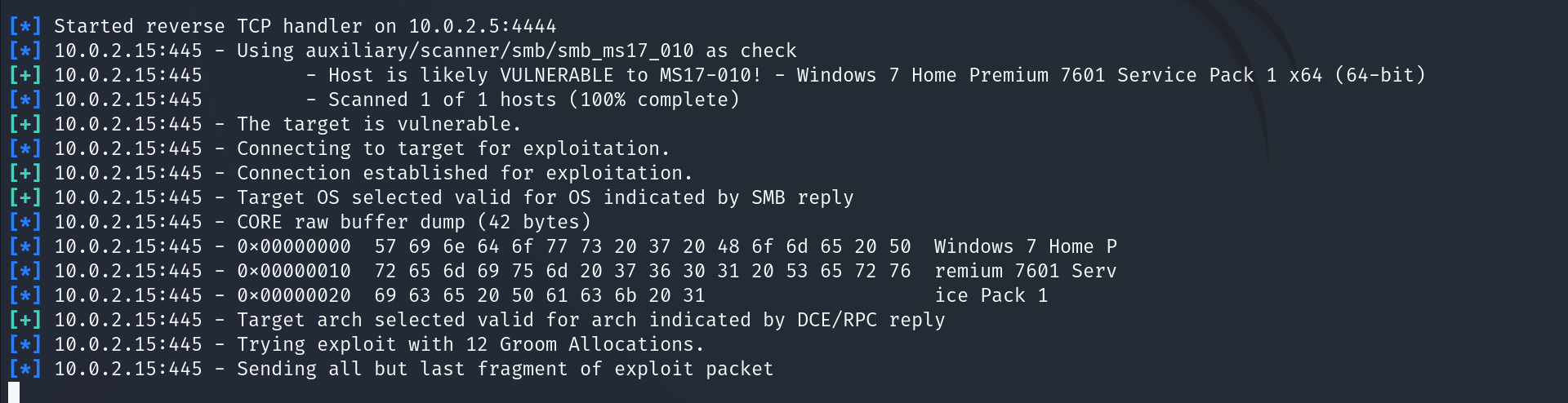 [+] 10.0.2.15:445 - Host is likely VULNERABLE to MS17-010! - Windows 7 Home Premium 7601 Service Pack 1 x64 (64-bit)