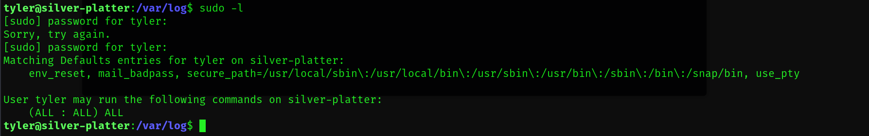 tyler 계정이 이미 root 이기 떄문에 쉽게 root.txt 플레그를 얻어낼수 있었습니다